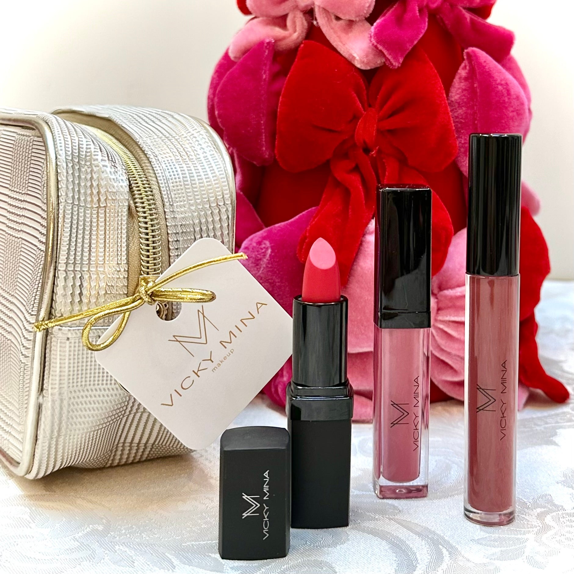 Holiday Lip Kit featuring 3 full sized products plus a cosmetics bag.
